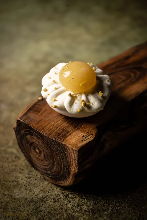 Ça commence dès les amuse-bouche avec cette tuile au suc de langoustine et au vinaigre de Douglas. Ça se poursuit en entrée avec ce caviar à la fleur d’oxalis servi avec une chapelure d’aileron de volaille ou cette anguille fumée accompagnée d’une crème granny Smith.