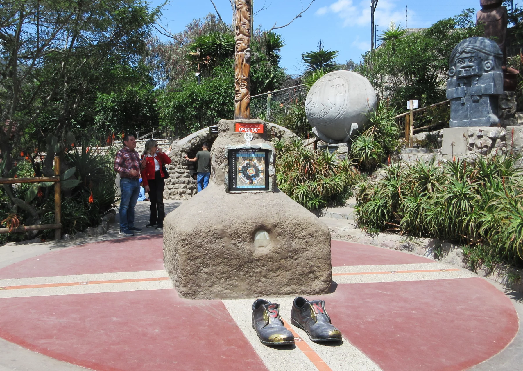 En Equateur, les occasions d’honorerl’équateur,traçant, à mi-chemin des pôles nord et sud, une ligne imaginaire autour de la Terre ne manquent pas. « La mitad del mundo » fait recette. A Calacali fut élevé en 1936 un monument de dix mètres. Trois fois plus haut, le plus imposant, érigé à San Antonio de Pichincha, date de 1979. A 47 kms au nord de Quito, le cadran solaire de Quitasato se distingue par une mosaïque circulaire de galets marquant solstices et équinoxes, au centre de laquelle trône un poteau coloré de dix mètres de haut ! On découvre aussi à San Luis de Guachala une sphère de pierre d’un diamètre de 1,80 mètre. A Cayambe, œuvre de l’artiste coréen Yoo Yong-Ho, deux effigies se saluent de part et d’autre d’un petit canal d’eau.Mais ma préférence va sans retenue à NitinanàSan Antonio de Pichincha. Un petit amour de musée interactif, pédagogique, ludique qui met le visiteur en situation. Ici, à la latitude 0°0’0’’, l’eau s’écoule dans le sens des aiguilles d’une montre, et, à quelques centimètres de la ligne fatidique, dans l’autre sens. On peut mettre un pied dans chaque hémisphère, faire tenir en équilibre un œuf sur la ligne magnétique. Bref apprendre et se divertir. Cerise sur le gâteau, ce musée nous instruit davantage sur les civilisations anciennes de l’Equateur : savoir par exemple comment réduire une tête, ou, moins sanglant, mieux comprendre les liens entre les mâts totémiques et Inti, le dieu inca du Soleil… Eclairant !