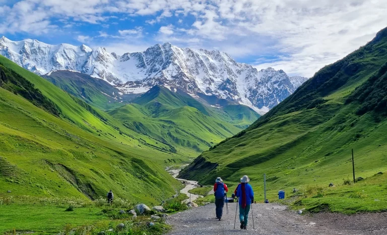 Au départ du village de Tsaldashi, il faut monter au col d’Ughviri à 2480 m d’altitude, en traversant une forêt de bouleaux. Le sentier plonge ensuite entre forêts et prairies jusqu’au village fortifié d’Adishi, situé à 2100 m d’altitude (10 km 892 m de dénivelé positif). Quelques familles vivent encore ici à l’année et il existe de nombreuses guesthouse pour passer la nuit. Le lendemain, on remonte la vallée en suivant le torrent dominé par le mont Tetnuldi. A hauteur du glacier d’Adishi, Il fait passer le torrent à cheval. C’est la seule solution. Des villageois sont postés la toute la journée pour faire traverser les randonneurs. Ensuite, longue montée jusqu’au col de Chkhutnieri à 2721 mètres d’altitude, avant de redescendre dans les alpages et le long des gorges jusqu’au village d’Iprari ou une seule famille vit ici toute l’année. (18, 5 km, 727 m de dénivelé positif). Le 3ème jour, descente jusqu’au village de Davberi, puis le sentier traverse une jolie forêt avant de rejoindre Ouchgouli, l’un des villages les plus hauts d’Europe, réputés pour ses tours défensives classées au patrimoine de l’Unesco. (15 km, 765 m de dénivelé positif).