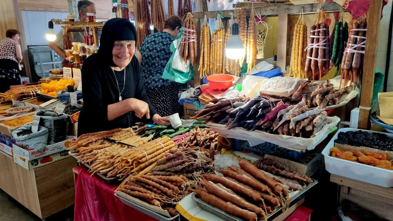 Il est 19 heures. Il est temps de se mettre à table. Comme chaque soir, nos hôtes ont mis les petits plats dans les grands. Chacun se sert dans la multitude de plats éparpillés sur la table. Là, il y a des champignons frits, ici des rouleaux d’aubergines garnis de noix et d’ail. Plus loin, des légumes grillés, une salade de tomates et de concombres, des gros raviolis à la viande de mouton, de la purée de haricot, du poisson en sauce, sans oublier l’éternelle khachapuri (un pain au fromage fondu). Tout est savamment épicé, relevé à la coriandre et arrosé d’un sapéravi de chez Marani. Incontournable. La Géorgie est considérée comme le berceau du vin. Des traces de vinification vieilles de plus de 8000 ans ont été datées par les archéologues. On y dénombre aujourd’hui encore plusieurs centaines de cépages et des cuvées de tout premier choix. Le vin est d’ailleurs le premier produit d’exportation du pays.