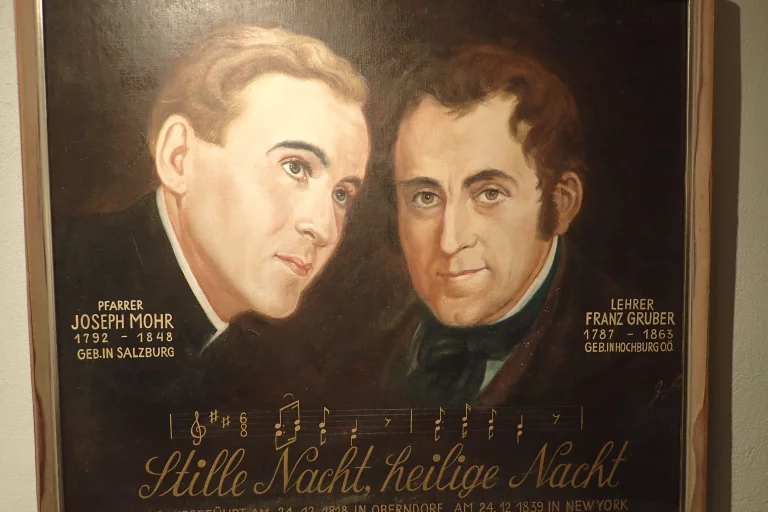Cette belle histoire débute en 1816. Dans une région martyrisée par les guerres napoléoniennes, un jeune prêtre, Joseph Mohr, écrit un poème qui exprime l’espoir d’une vie meilleure et en paix. Deux ans plus tard, voulant offrir une belle cérémonie à ses paroissiens, il demande à son ami Franz Gruber, instituteur et organiste, de mettre ce poème en musique pour 2 voix solo avec chœur et accompagnement à la guitare.