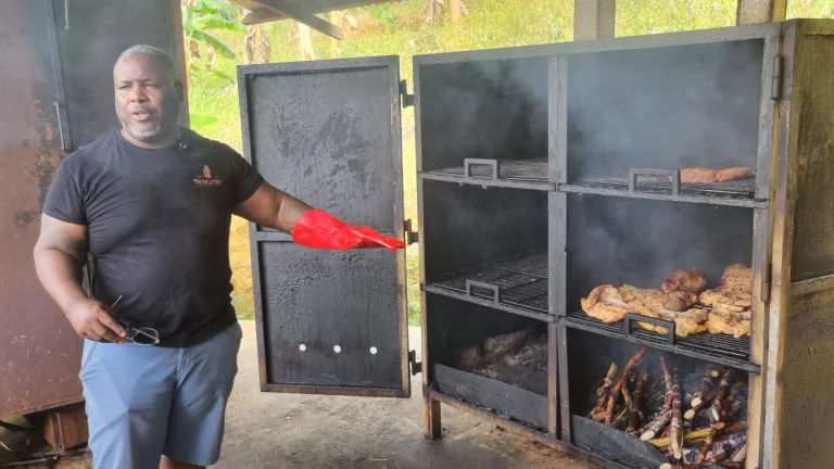Au milieu d’une végétation équatoriale luxuriante, Jean-Hubert François ouvre la double porte d’une imposante armoire métallique noircie par la fumée. A l’intérieur, sur des grilles, il y a du poulet, un gigot, du porc, des magrets de canard… Et au bas de l’armoire, un foyer alimenté par du charbon de bois, étouffé avec du pain humide et de la bagasse (Ce qu’il reste de la canne à sucre après l’extraction du suc). Cette manière de cuire la viande à basse température (entre 60 et 70 degrés) tout en la fumant s’appelle le boucanage, une pratique héritée des Amérindiens et encore très répandue en Amérique, dans les Antilles et les îles de l’océan Indien . La viande est toujours préalablement marinée dans une infusion d’eau vinaigrée, salée et poivrée pendant 24 h. Il faut ensuite compter 2 h pour cuire un magret de canard rosé, 4 heures pour un poulet, 5 heures pour un gigot…