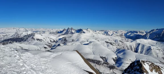 Si l’Alpe d’Huez est mondialement connue pour être une étape mythique du Tour de France cycliste (21 lacets sur plus de 1000 mètres de dénivelés), les sports d’hiver y ont une longue tradition avec l’arrivée du premier remonte-pente dès 1936. Ensuite, il aura fallu attendre jusqu’en 1963 pour pouvoir atteindre facilement le Pic Blanc qui culmine à 3 300 m. Avec ou sans skis, la montée est incontournable tant la vue panoramique à 360° sur les sommets alpins est époustouflante : le Mont Blanc, la Meije, la barre des Écrins, les aiguilles d’Arves ou encore le Mont Ventoux. Un panorama classé trois étoiles par le guide Michelin qui ne note pas uniquement des restaurants (dont on trouve quelques excellents dans la station).
