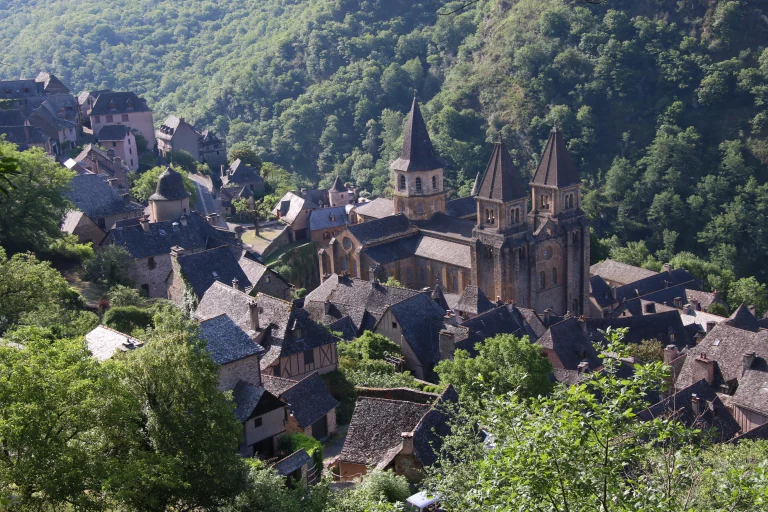 Quelle émotion quand on découvre depuis la route en surplomb le petit village de Conques. Niché au creux de la vallée de l’Ouche, dans un écrin de verdure, Conques affiche fièrement ses belles demeures construites en gré rouge et coiffées de solides toits de lauzes. Entre ruelles et escaliers, l’harmonie architecturale est quasi parfaite. Mais le must reste la sublime abbatiale dont les vitraux ont été réalisés en 1994 par l’enfant du pays, Pierre Soulages.