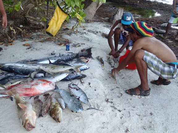 Steeve s'amuse de jeter des morceaux de pain dans l'eau, ce qui provoque un véritable tollé ! Penché au bord du catamaran, les poissons viennent lui manger dans la main et il en profite pour en sortir un ! Non, celui-ci n'agrémentera pas le dîner, Steve le remet rapidement à l'eau.