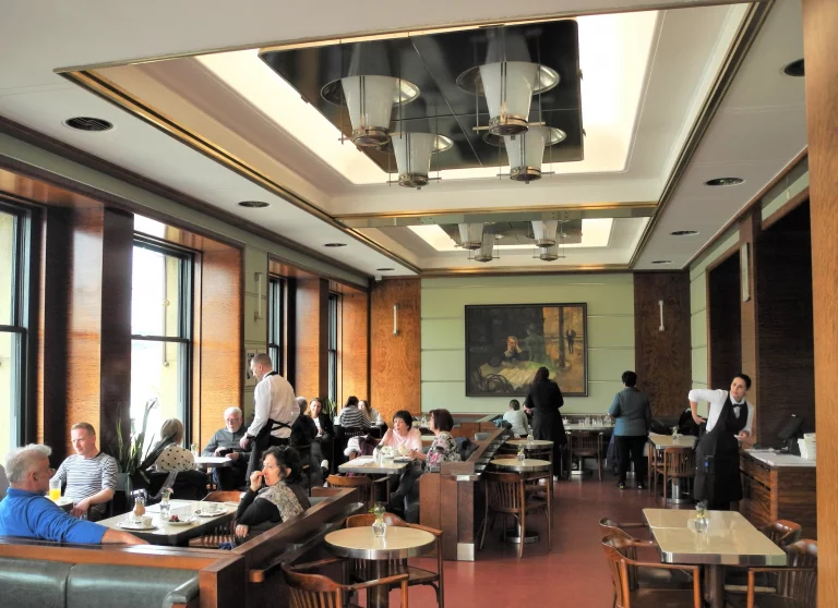 Lieux et temps de création, d’innovation, voire de transgression, les empreintes architecturales de Prague sont si riches, si variées. Limitons-nous ici à ces lieux d’échanges qui, témoins ou non de l’Histoire, animent encore et toujours la capitale tchèque, parlons donc de ses cafés totems. Le Slavia, et ses grandes baies vitrées ouvrant sur la Vltava, associent à son style fonctionnaliste des éléments Art Déco. Les écrivains, poètes et artistes aimaient s’y retrouvaient pour refaire le monde. Vaclav Havel et les intellectuels de la Charte 77 ne furent pas les derniers à y organiser la dissidence. Il faut aussi s’arrêter, sur la Poříčí, à l’Hôtel Impérial et se poser dans son café Art déco, aux céramiques précieuses, qui accueillit jadis Joseph Kafka. Une nature sublimée y communie avec l’art. Une autre adresse Art Déco est à noter, le café Lucerna au cœur du passage du même nom. Dans le centre historique, l’une des pièces maîtresses et pionnières (1912), signée de l’inventif architecte JosefGočár, a pour nom la Maison de la Vierge noire, au coin de Celetná, rue commerçante et chic de la Vieille Ville, et de la rue Ovocný. Musée, boutique de design et Grand café d’Orient : ici tout est résolument cubiste. Citons encore le Café national, sur la Narodni, rendez-vous de l’élite culturelle tchèque dans les années 1920 et toujours d’une finesse exquise. Dans la même rue, au 22, Einstein préférait se poser au Café Louvre, et son décor or, rouge et crème. Une halte Art nouveau privilégiera l’Obecní dům au rez-de-chaussée de la Maison municipale.