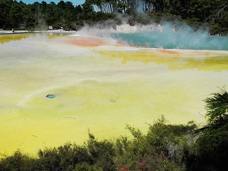 « Le pays des merveilles thermales » : ainsi nomme-t-on le parc géothermique de Wai-O-Tapu, situé à une trentaine de kilomètres au sud de Rotorura. Si la baignade est déconseillée, pour cause d’extrême acidité, voire d’arsenic, le charme opère sur près de 18 km2. Couleurs vives et improbables, bouillonnements mystérieux, fumerolles inquiétantes, encriers du diable, Champagne pool, chemin sacré, poêle à frire… : le parcours est riche en surprises. Vieille de millions d’années et toujours active, une vie secrète anime les lieux, dans un cadre resté naturel, ce qui ne gâte rien, en dépit des nécessaires précautions d’usage. A recommander pour petits et grands, en se méfiant de l’affluence matinale (pour cause de geyser).