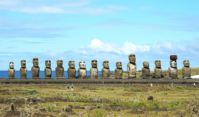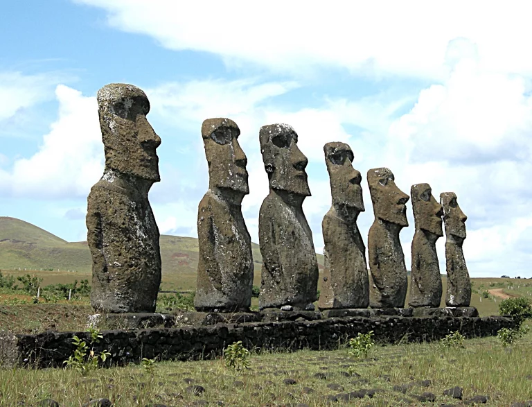 Place donc aux fameux moaïs, dressées sur les Ahu, les plateformes cérémonielles, en un lien avec l’au-delà. On dénombre sur l’île 887 de ces mégalithes dédiés au culte des ancêtres, taillés dans le basalte et le tuf volcaniques, de 2 à 10 mètres de hauteur, de 10 à 80 tonnes. Pouvoir et spiritualité se mêlent en ces lieux qui invitent à la contemplation, à l’introspection. A chacun, son identité, oserais-je dire ! Tous tournent le dos à l’océan, à l’exception d’Ahu Akivi érigé à l’intérieur des terres, à 2,6 kms de la côte sur un flanc du volcan Maunga Tereveka, le point culminant de l’île à 507 mètres d’altitude. Tous se dressent en fait à deux pas des emplacements de villages qu’ils veillaient et ainsi protégeaient. Ou les esprits des ancêtres dialoguant avec leurs descendants, œuvrant pour le bien des vivants !